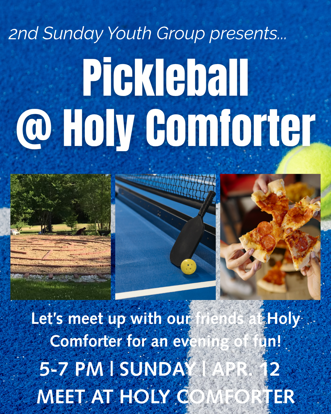 Holy Comforter Episcopal Church 2015 Fleishmann Road, Tallahassee, FL, United StatesSecond Sunday Youth Group: Pickleball SUNDAY | APR. 12 | 5-7 PM | HOLY COMFORTER This month’s Second Sunday Youth